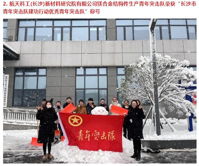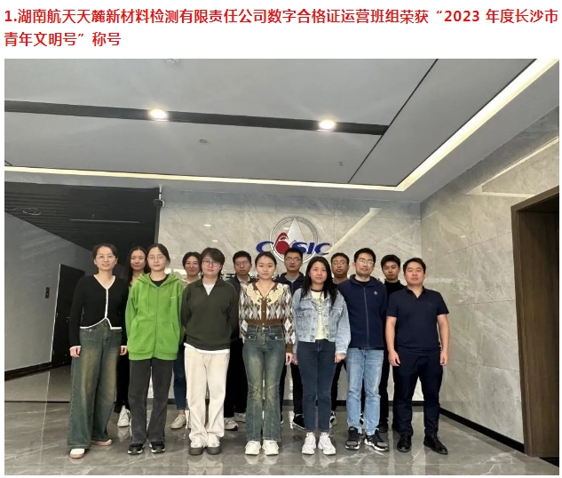 湖南航天天麓新材料檢測(cè)有限責(zé)任公司數(shù)字合格證運(yùn)營班組獲評(píng)“2023年度長(zhǎng)沙市青年文明號(hào)”稱號(hào);航天科工(長(zhǎng)沙)新材料研究院有限公司鎂合金結(jié)構(gòu)件生產(chǎn)青年突擊隊(duì)獲評(píng)“長(zhǎng)沙市青年突擊隊(duì)建功行動(dòng)優(yōu)秀青年突擊隊(duì)”稱號(hào);航發(fā)公司周紅獲評(píng)“2023 年度長(zhǎng)沙市青年崗位能手”稱號(hào)。