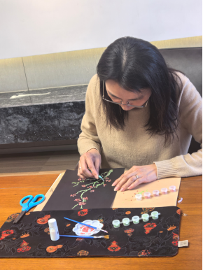 大家紛紛拿起工具,挑選心儀圖案,開啟沉浸式手工創(chuàng)作。通過精心挑選、切割螺鈿片,再將其精準(zhǔn)鑲嵌于底板之上,整個過程考驗?zāi)托呐c審美,并讓大家樂在其中。經(jīng)過一個多小時的精心制作,藍(lán)綠牡丹、火紅梅花、多彩蝴蝶等一幅幅精美獨特的螺鈿作品陸續(xù)完成,在光影下盡顯螺鈿獨有的溫潤光澤與細(xì)膩質(zhì)感。
